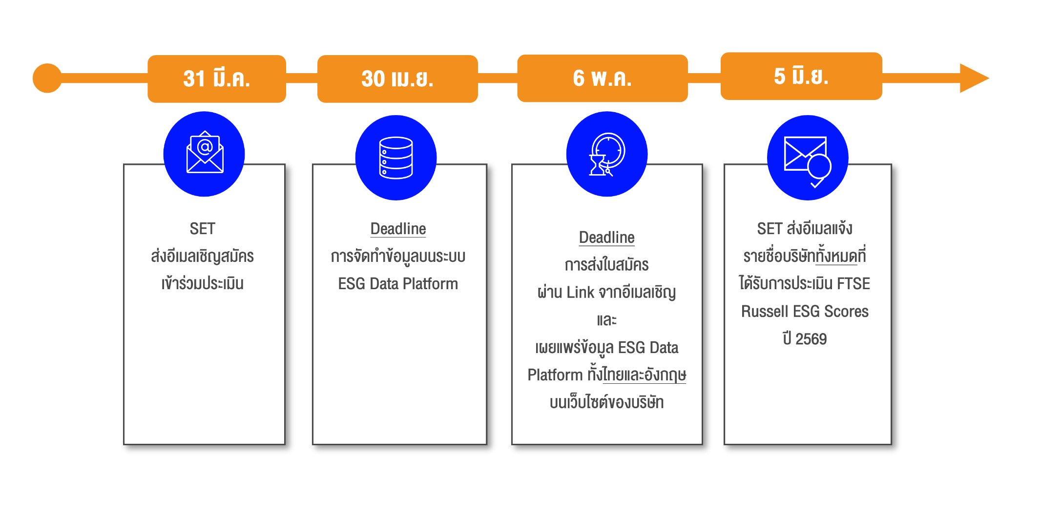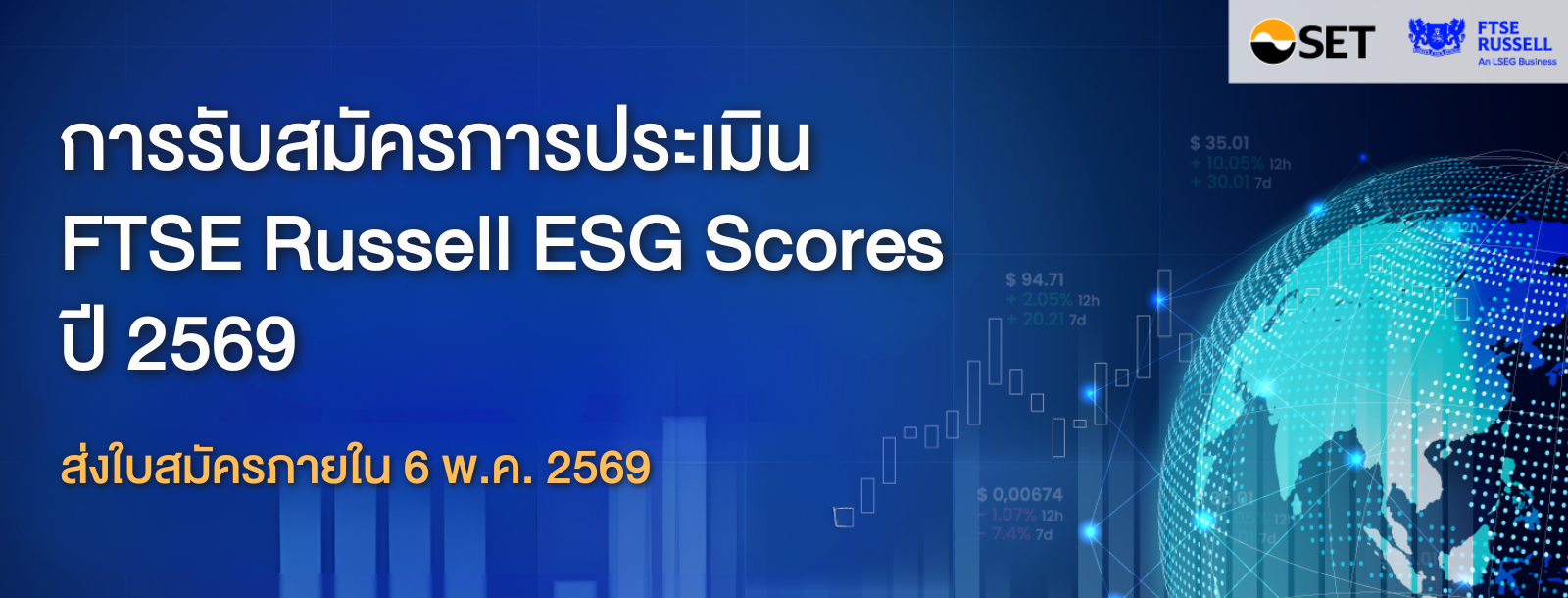 - ต้องการรับใบสมัครเข้าร่วมการประเมิน FTSE Russell ESG Scores ประจำปี 2569 (สำหรับกลุ่มสมัครใจเท่านั้น) โปรดติดต่ออีเมล SETsustainability@set.or.th เพื่อขอรับใบสมัครตั้งแต่ 31 มี.ค. 2569 เป็นต้นไป