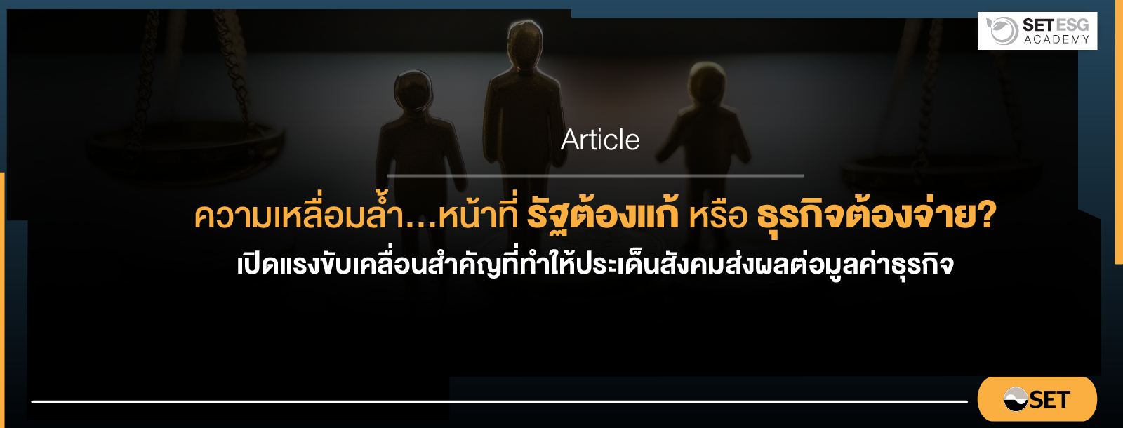 ในอดีต ผู้ลงทุนมักจัดประเด็นทางสังคม (Social Issues) เช่น ประเด็นความเหลื่อมล้ำ ไว้ในกลุ่มความเสี่ยงนอกงบการเงิน (Non-financial risk:NFR) หรือเป็นเพียงกิจกรรมเพื่อสังคมที่แยกขาดจากการดำเนินการของธุรกิจหลัก โดยมักให้ความสำคัญน้อยกว่าประเด็นด้านสิ่งแวดล้อมที่มีเครื่องมือประเมินมูลค่าชัดเจนกว่า อย่างไรก็ตาม เมื่อพิจารณาข้อมูล แนวโน้มและผลการศึกษาที่ประเมินผลกระทบทางการเงินจากประเด็นด้านสังคมในช่วง 10 ปีที่ผ่านมา ได้พิสูจน์ให้เห็นแล้วว่าประเด็นสังคมส่งผลกระทบต่อ "มูลค่ากิจการ" (Valuation) และ "ต้นทุนทางการเงิน" อย่างมีนัยสำคัญ