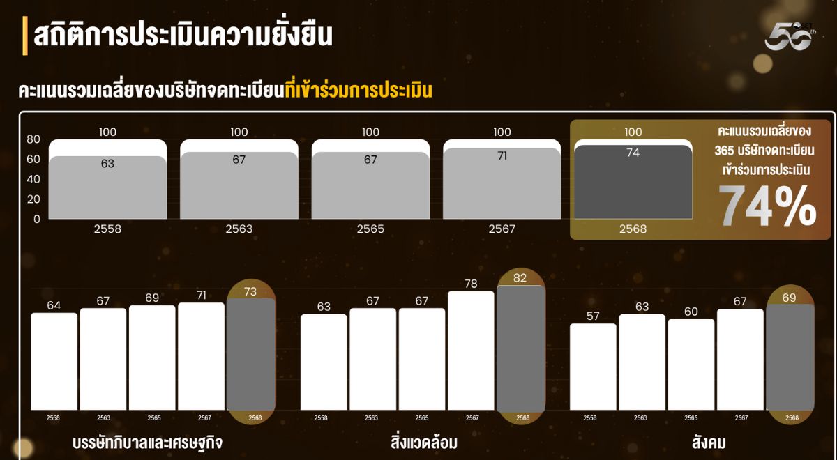ปี 2568 นี้บริษัทมีผลคะแนนจากแบบประเมินสูงขึ้นในทุกมิติ แสดงให้เห็นถึงความพร้อมของบริษัทจดทะเบียนในการก้าวสู่การประเมินตามมาตรฐานสากล โดยเฉพาะมิติสิ่งแวดล้อมที่มีคะแนนเกิน 80 คะแนนเป็นครั้งแรก สะท้อนความมุ่งมั่นในการตั้งเป้าหมายการปล่อยก๊าซเรือนกระจกสุทธิเป็นศูนย์ (Net Zero) และการกำหนดบทบาทของคณะกรรมการบริษัทและผู้บริหารให้ต้องกำกับดูแลความเสี่ยงและติดตามผลการดำเนินงานที่เกี่ยวข้องกับการเปลี่ยนแปลงสภาพภูมิอากาศ