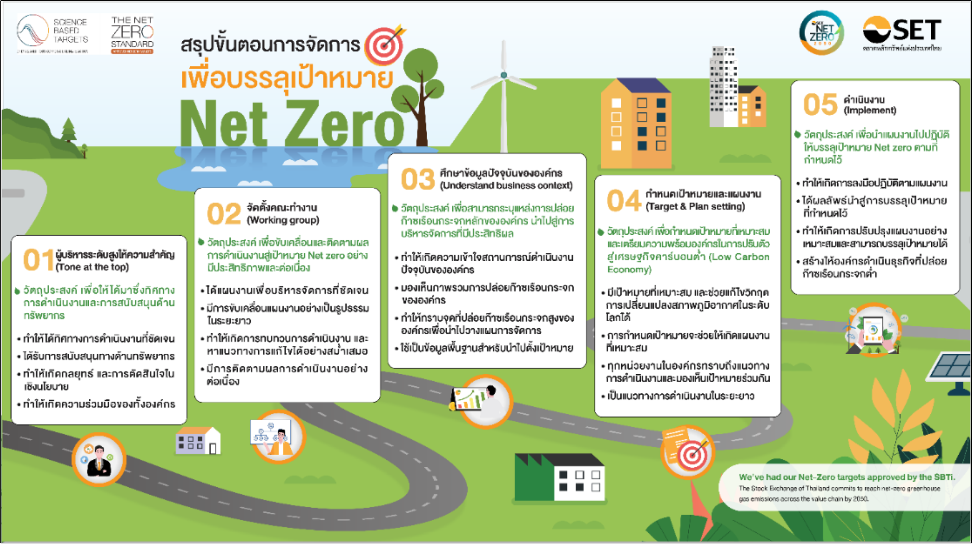 ตลาดหลักทรัพย์ฯ ตระหนักถึงความเร่งด่วนนี้เป็นอย่างดี จึงได้ประกาศเป้าหมายอันมุ่งมั่นสู่การบรรลุ "Net Zero ภายในปี ค.ศ. 2050" ซึ่งเป็นเป้าหมายที่ได้รับการรับรองจาก Science Based Targets initiative (SBTi) สอดคล้องกับเจตนารมณ์ของความตกลงปารีสในการจำกัดอุณหภูมิโลกให้สูงขึ้นไม่เกิน 1.5 องศาเซลเซียส ทั้งนี้ การดำเนินงานของตลาดหลักทรัพย์ฯ เพื่อให้บรรลุเป้าหมายที่ท้าทายนี้ ได้ถูกวางแผนอย่างเป็นระบบผ่าน 5 ขั้นตอนหลัก ดังนี้