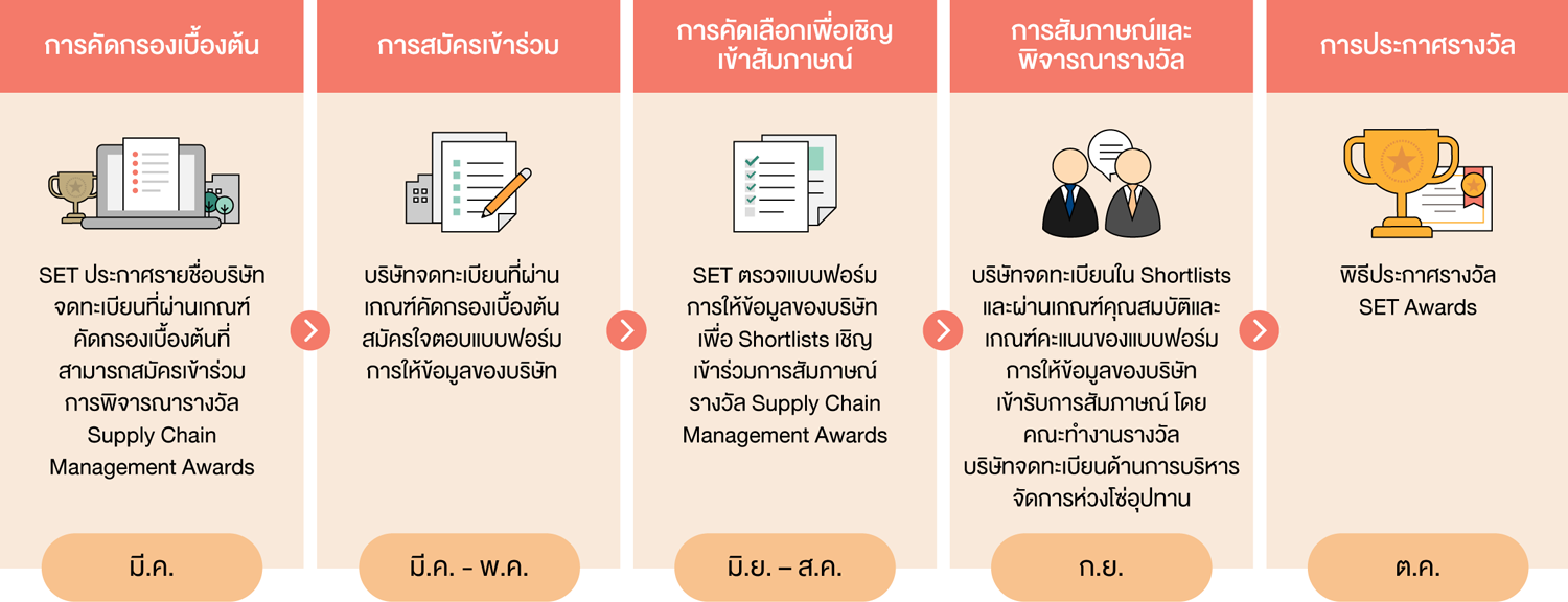 ตลาดหลักทรัพย์ฯ จัดให้มีคณะกรรมการพิจารณารางวัล Supply Chain Management Awards ประกอบด้วยผู้ทรงคุณวุฒิและผู้เชี่ยวชาญที่มีความรู้และประสบการณ์ด้านการบริหารจัดการองค์กรอย่างยั่งยืน รวมถึงการบริหารจัดการห่วงโซ่อุปทาน เพื่อทำหน้าที่พิจารณาคัดเลือกบริษัทจดทะเบียนที่มีความเหมาะสมเข้ารับรางวัลโดยมีขั้นตอนการพิจารณาตัดสินรางวัล ดังนี้