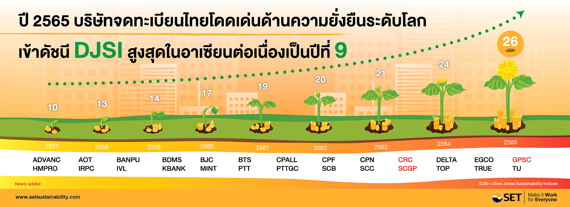 รายชื่อบริษัทจดทะเบียนที่เป็นสมาชิก และได้รับเชิญเข้าร่วมประเมินดัชนี Dow Jones Sustainability Indices (DJSI) 2565 (Click)