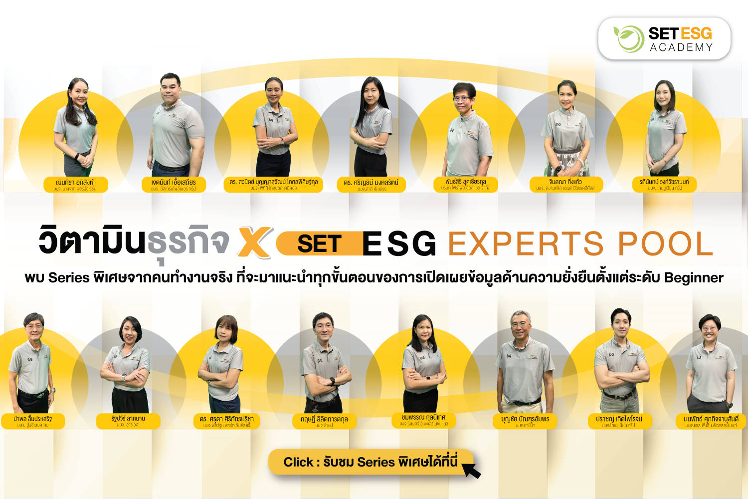 จึงจัดทำ รายการ วิตามินธุรกิจ x SET ESG Experts Pool ร่วมกับ SET ESG Experts Pool เครือข่ายบุคลากรด้านความยั่งยืนในภาคตลาดทุนไทย ขึ้น เพื่อขยายความรู้ความเข้าใจด้านการดำเนินธุรกิจเพื่อความยั่งยืนให้แก่สมาชิกในตลาดทุน โดยเอา Pain Points หรือประเด็นปัญหาอุปสรรคในการทำงาน มาคุยกันและหาคำตอบจากมุมผู้ปฏิบัติงานจริง ปี 2565 รายการวิตามินธุรกิจ x SET ESG Experts Pool เรามี Series ที่มาพูดถึง การเปิดเผยข้อมูลด้านความยั่งยืน ซึ่งเชื่อว่าจะเป็นจุดเชื่อมสำคัญระหว่างนักลงทุนกับผู้ประกอบการ ก็ได้สมาชิก Experts Pool มาร่วมออกแบบโครงสร้างเนื้อหาและมาช่วยกัน Share ประสบการณ์ในการเปิดเผยข้อมูลด้านความยั่งยืน มาปีนี้ 2566 เรามองว่า ในยุควิกฤตซ้อนวิกฤต และการเปลี่ยนแปลงฉับพลันรุนแรงนี้ ปัจจัยสำคัญที่ทำให้เราปรับตัวได้รวดเร็ว เพื่อลดความเสี่ยง คว้าโอกาสใหม่ๆ และรักษาขีดความสามารถในการแข่งขัน พร้อมกับไม่สร้างผลกระลบเชิงลบกับส่วนรวม แต่สร้างการเติบโดร่วมกันกับสังคมและสิ่งแวดล้อมได้ คือ “คนที่มีคุณภาพ” ในช่วง 2-3 ปีที่ผ่านมา มีกลุ่มอาชีพหนึ่งที่มาแรงและเป็นที่ต้องการของตลาดแรงงานอย่างมาก SET จึงได้เชิญพี่ ๆ เครือข่าย SET ESG Experts Pool มาร่วมแลกเปลี่ยนประสบการณ์ และไขความลับของอาชีพกลุ่มนี้กัน มาร่วมหาคำตอบกันใน Series ใหม่ กับ “อาชีพด้านความยั่งยืนในภาคตลาดทุน (ESG Professionals in Capital Market Landscape)” แต่ละ Episode เราได้เชิญพี่ ๆ SET ESG Experts Pool ที่ล้วนเป็นผู้เชี่ยวชาญด้านความยั่งยืน แต่มีหลาก Background และปัจจุบันทำงานอยู่ในหลายส่วนงานในองค์กร ไม่ว่าจะเป็น HR Communication หรือ Legal มาร่วมแลกเปลี่ยนจากมุมมองคนทำงานจริงที่มีประสบการณ์จริง