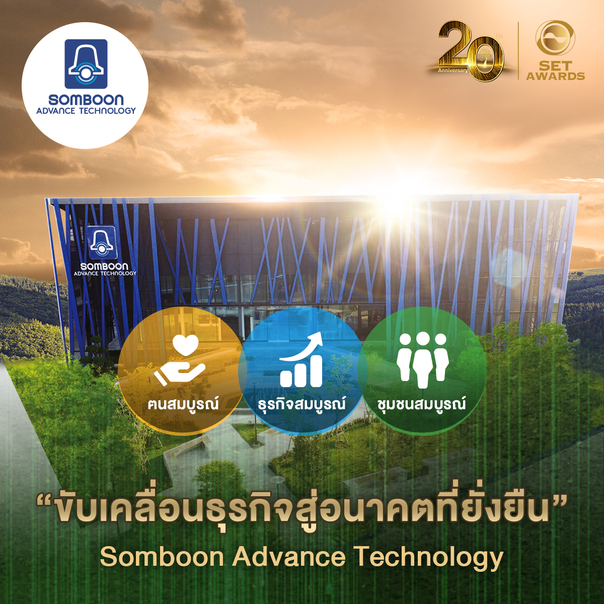 สมบูรณ์แอ๊ดวานซ์เทคโนโลยี (SAT) “ขับเคลื่อนธุรกิจสู่อนาคตที่ยั่งยืน” ด้วยการปรับกลยุทธ์ธุรกิจและขับเคลื่อนองค์กรให้เท่าทันกับการเปลี่ยนแปลงของปัจจัยต่างๆ และตอบสนองความต้องการของผู้มีส่วนได้เสียรอบด้าน ความมุ่งมั่นอย่างต่อเนื่องนี้ส่งผลให้ได้รับรางวัล Sustainability Awards of Honor ในปี 2564 และรางวัล Best Sustainability Awards ติดต่อกัน 3 ปีขึ้นไปจากงาน SET Awards