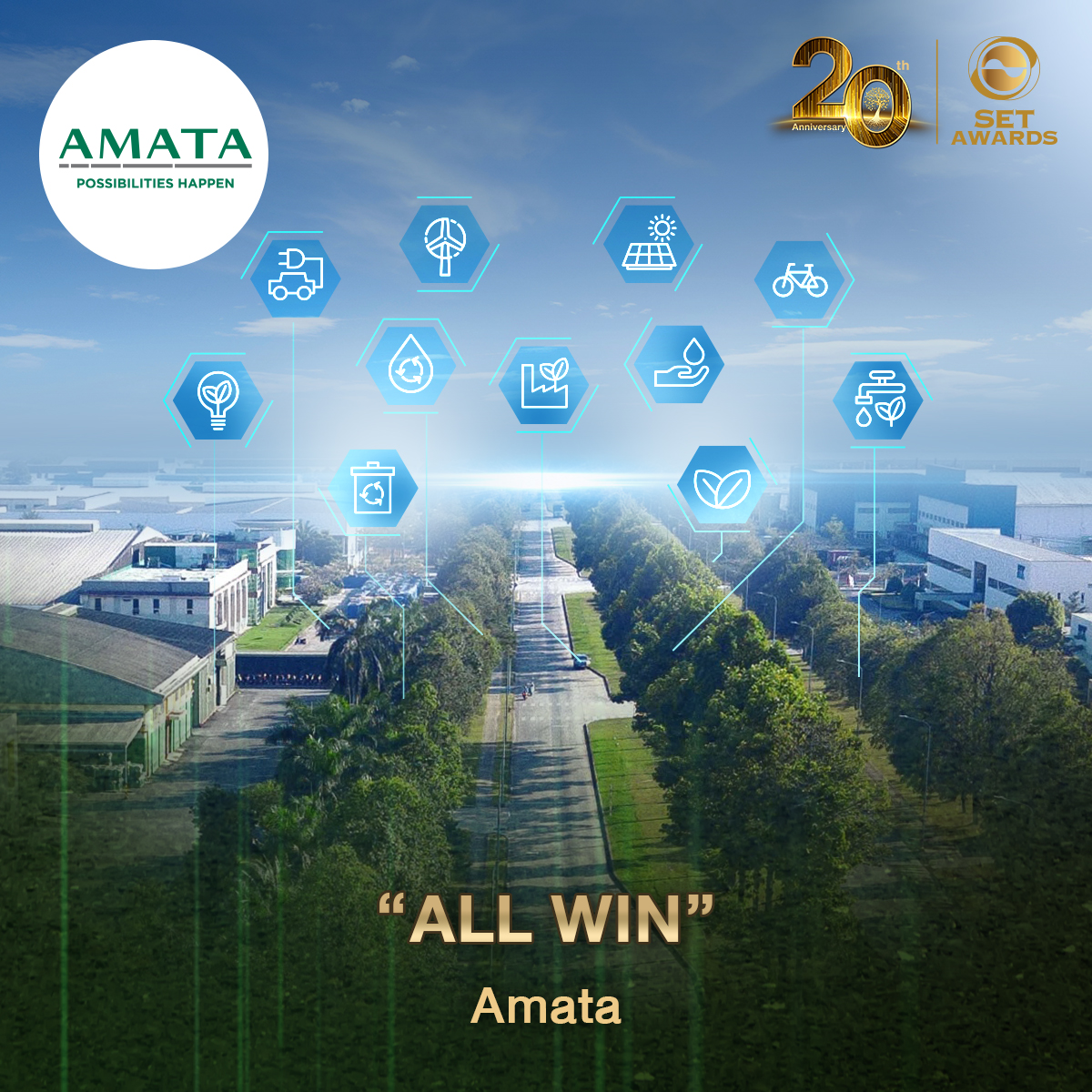 ธุรกิจนิคมอุตสาหกรรมขนาดใหญ่ของ AMATA นั้นเกี่ยวข้องกับการใช้ทรัพยากรในปริมาณมาก และผู้มีส่วนได้เสียรอบด้านหลายฝ่าย ทั้งทางตรงและทางอ้อม ถือเป็นความท้าทายที่บริษัทต้องทุ่มเทอย่างต่อเนื่อง เพื่อพัฒนานิคมอุตสาหกรรมให้เติบโตควบคู่ไปกับการดูแลพนักงาน ลูกค้า คู่ค้า ชุมชน และสิ่งแวดล้อมโดยรอบ และจากการทำงานโดยยึดหลักปรัชญา “ALL WIN” ทำให้ AMATA ได้รับรางวัล Best Sustainability Awards ในปี 2564 และ 2562 จากงาน SET Awards
